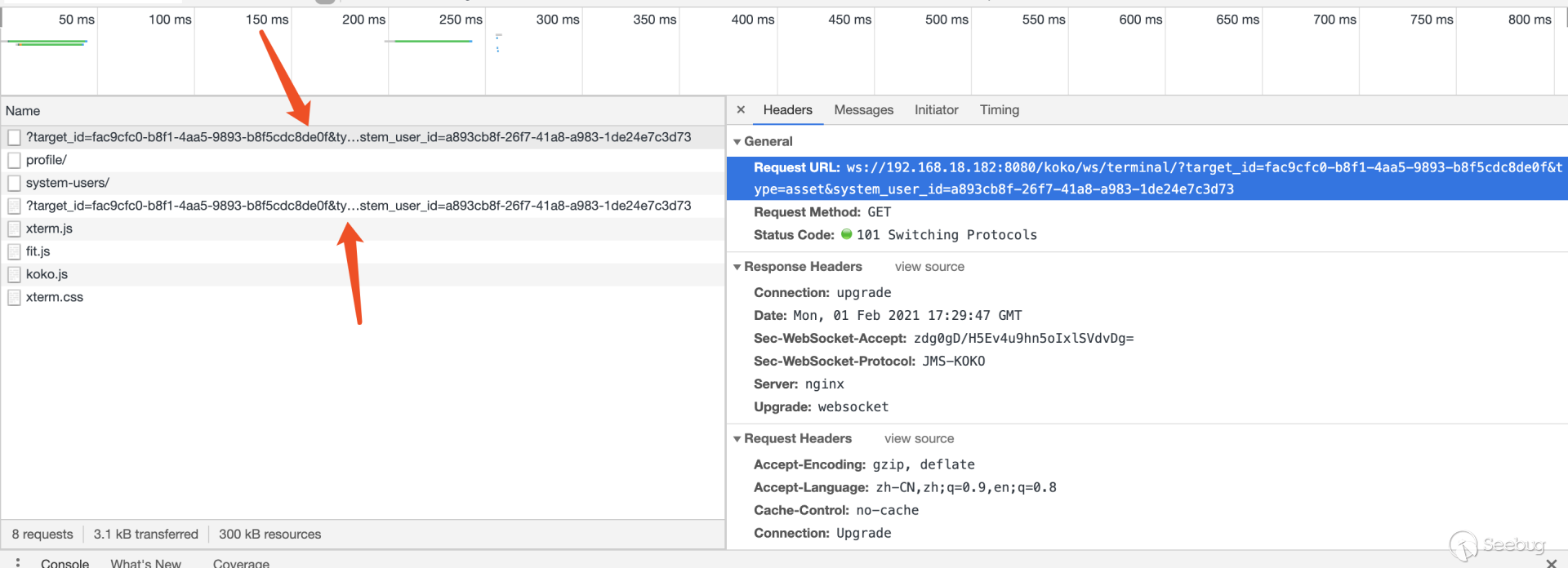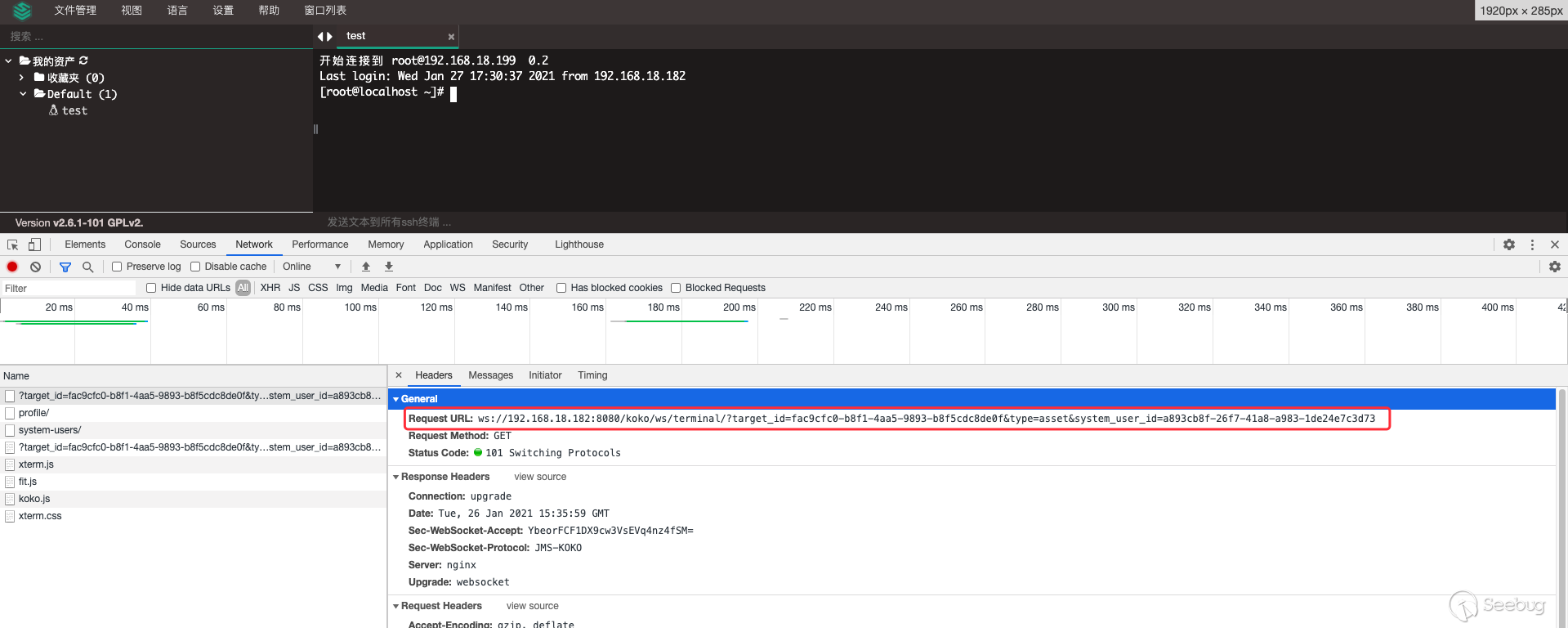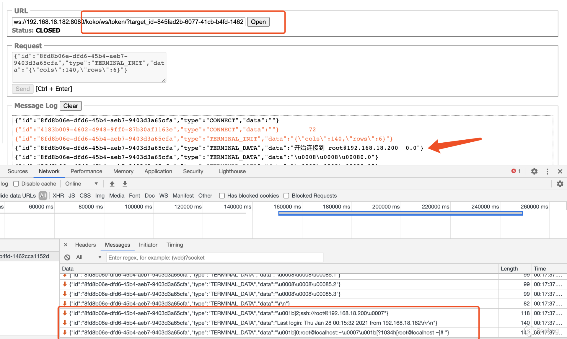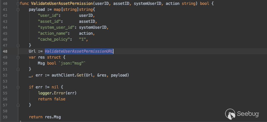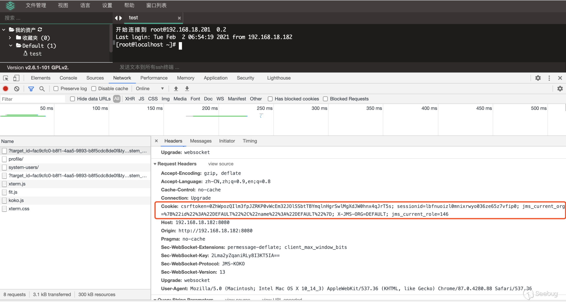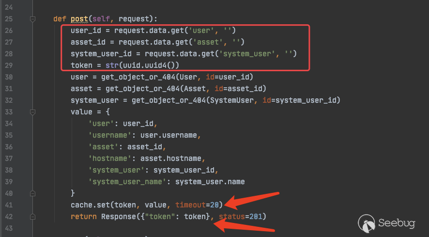5.后台从SSH Channel中拿到按照终端大小的标准输出,通过Socket通信将输出返回给浏览器,由此实现了Web Terminal 携带多个参数对 /koko/ws/terminal/ 接口发起Get请求,初次握手,提出Upgrade为Websocket协议 GET ws://192.168.18.182:8080/koko/ws/terminal/?target_id=fac9cfc0-b8f1-4aa5-9893-b8f5cdc8de0f&type=asset&system_user_id=a893cb8f-26f7-41a8-a983-1de24e7c3d73 HTTP/1.1Host: 192.168.18.182:8080Connection: UpgradePragma: no-cacheCache-Control: no-cacheUser-Agent: Mozilla/5.0 (Macintosh; Intel Mac OS X 10_14_3) AppleWebKit/537.36 (KHTML, like Gecko) Chrome/87.0.4280.88 Safari/537.36Upgrade: websocketOrigin: http://192.168.18.182:8080Sec-WebSocket-Version: 13Accept-Encoding: gzip, deflateAccept-Language: zh-CN,zh;q=0.9,en;q=0.8Cookie: csrftoken=0ZhWpozQIlm3fpJZRKP0vWcEm32JOlSSbtTBYmqlnHgrSwlMgXdJW0hnx4qJrT5s; sessionid=lbfnuoizl0mnixrwyo036ze65z7vfip0; jms_current_org=%7B%22id%22%3A%22DEFAULT%22%2C%22name%22%3A%22DEFAULT%22%7D; X-JMS-ORG=DEFAULT; jms_current_role=146Sec-WebSocket-Key: Cuf/c4n9TH20PU4HpCP4qQ==Sec-WebSocket-Extensions: permessage-deflate; client_max_window_bitsSec-WebSocket-Protocol: JMS-KOKO服务端识别有效字段,回应握手请求,同意upgrade为websocket协议,允许后续进行socket通信。 HTTP/1.1 101 Switching ProtocolsServer: nginxDate: Mon, 01 Feb 2021 17:29:47 GMTConnection: upgradeUpgrade: websocketSec-WebSocket-Accept: zdg0gD/H5Ev4u9hn5oIxlSVdvDg=Sec-WebSocket-Protocol: JMS-KOKO注意到使用web终端功能时,系统主要发起两个请求,分别是 ws://192.168.18.182:8080/koko/ws/terminal/?target_id=fac9cfc0-b8f1-4aa5-9893-b8f5cdc8de0f&type=asset&system_user_id=a893cb8f-26f7-41a8-a983-1de24e7c3d73http://192.168.18.182:8080/koko/ ... 8-a983-1de24e7c3d73实际进行sokcet通信的是/koko/ws/terminal/接口,/koko/terminal/接口是协调处理sokcet通信输入输出的数据,将结果与前端融合并展示给用户,提供一个可视终端的效果。 Websocket认证即使用户经过了系统的认证,当与WebSocket接口进行socket连接时,同样需要再次认证。 一般Websocket的身份认证都是发生在握手阶段,客户端向验证请求中的内容,只允许经过身份验证的用户建立成功的Websocket连接。 可以通过基于cookie的传统方式,或基于Token的方式进行认证。 传统的基于cookie的方式采用这种方式,应用本身的认证和提供WebSocket的服务,可以是同一套session cookie的管理机制,也可以WebSocket服务接口自己来维护基于cookie的认证。 Jumpserver系统Web终端的功能,调用的/koko/ws/terminal/接口就是采用这种方式。 ws://192.168.18.182:8080/koko/ws/terminal/?target_id=fac9cfc0-b8f1-4aa5-9893-b8f5cdc8de0f&type=asset&system_user_id=a893cb8f-26f7-41a8-a983-1de24e7c3d73请求URL中携带的参数值 target_id、type、system_user_id 基本长期复用,接口主要依靠建立会话传送的Cookie来识别身份,这里的session cookie的管理机制与系统是共享的。 基于Token的方式当客户端要与接口建立连接时,向http服务获取token,客户端作为初始握手的一部分携带有效token打开websocket连接,服务端验证token有效性合法性,认证通过则同意建立websocket会话连接。 漏洞执行命令利用的/koko/ws/token/接口采用的就是基于token方式进行认证 ws://192.168.18.182:8080/koko/ws/token/?target_id=845fad2b-6077-41cb-b4fd-1462cca1152d接口取target_id参数值,识别参数值有效性及对应用户身份,认证通过则同意建立websocket连接。 认证方式对比传统基于cookie的方式,若websocket接口与系统协调同一种共享的认证方式,造成websocket服务与应用服务的耦合性大,依赖性强。若websocket服务自己维护基于cookie的认证,它只是一个解决通信连接的服务,为此付出成本不小。综上,还是采用基于token的认证方式更加高效。 采用基于token的认证方式则需要考虑提供token服务的API安全性,如本文分析的漏洞,提供token的/connection-token接口存在认证绕过问题,攻击者通过绕过/connection-token接口的身份验证,获取token,在有效时间内可与目标建立websocket连接。 0x05利用工具编写思路1.读取日志 根据上文漏洞利用的流程,需要先通过未授权的/ws/ops/tasks/log/接口读取日志文件/opt/jumpserver/logs/gunicorn.log ,其中包含大量的接口请求记录,我们需要提取/api/v1/perms/asset-permissions/user/validate/ 接口信息。 2.筛选可用资产 日志文件中提取出的数据为历史连接记录,但不一定可以被利用,需要对其进行连接测试,筛选出可被利用的资产。 3.执行命令 在可用资产列表中选择目标进行攻击,执行指定命令。 总结1.通过未授权的 /ws/ops/tasks/log/ 接口读取日志文件,我们仅筛选了部分接口信息,日志中包含大量数据,还有更多利用价值。 Y* M# ^" r4 l5 Q$ D+ p
