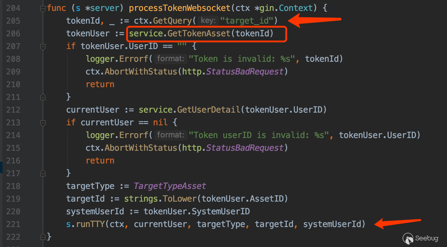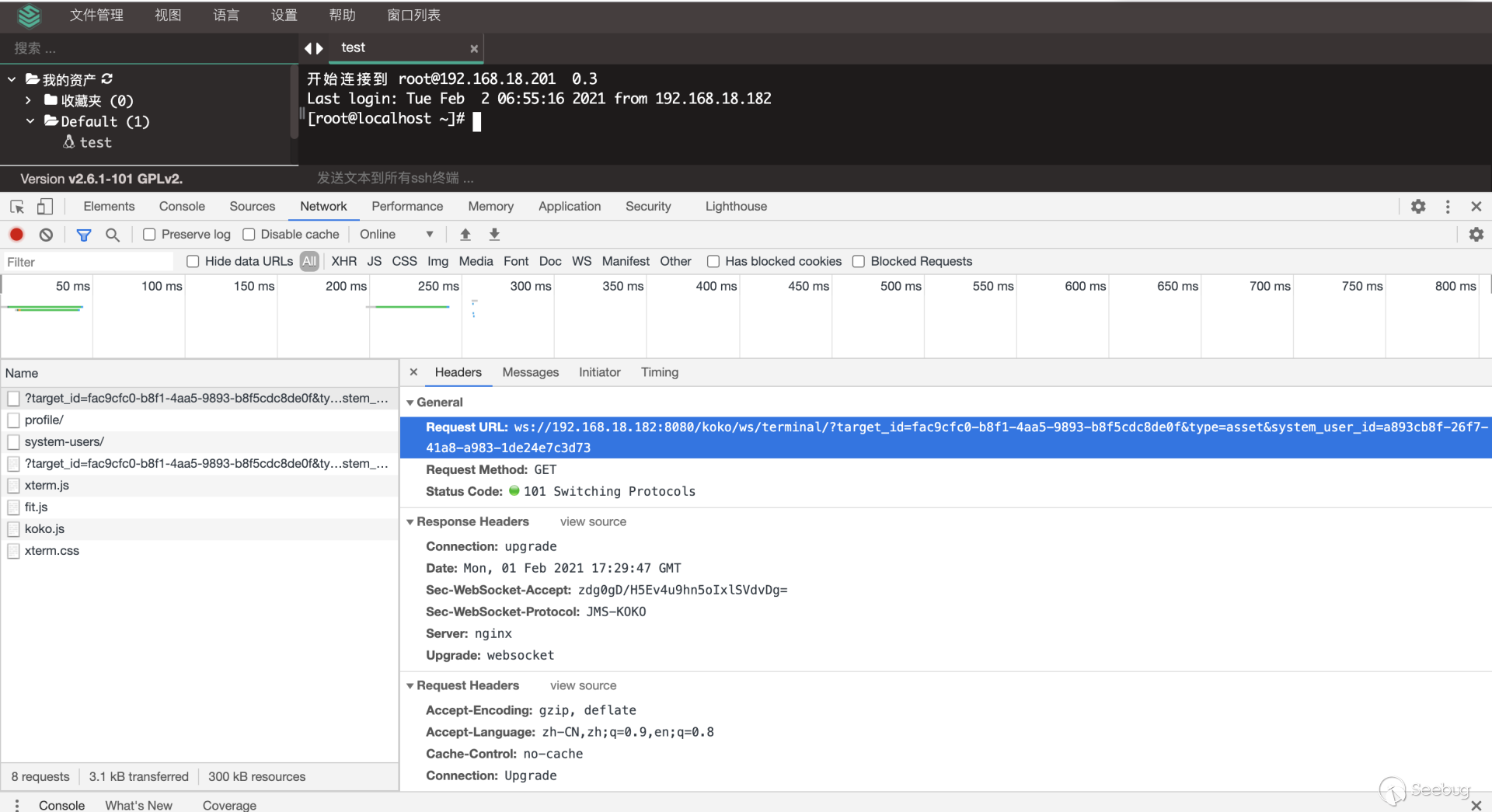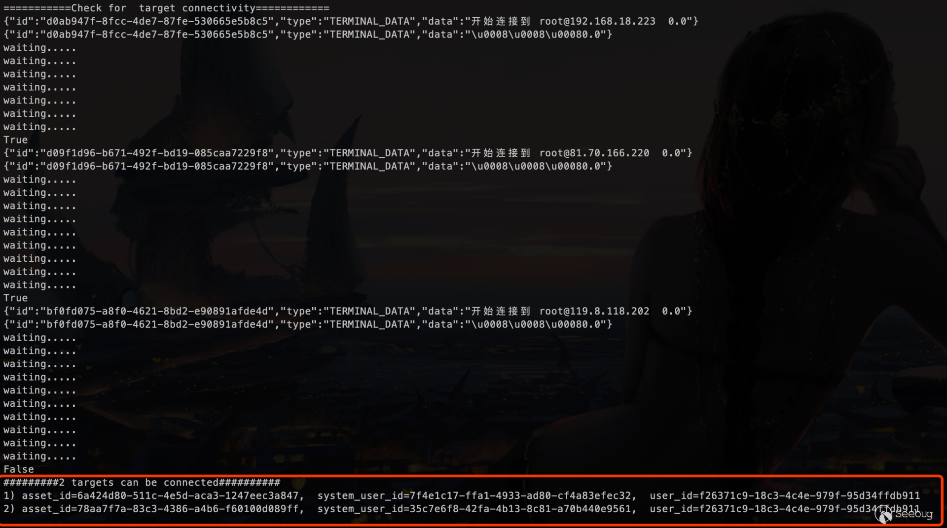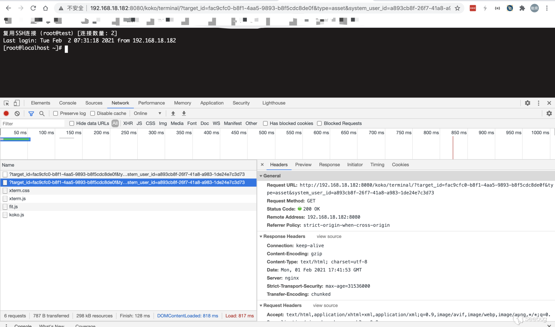 5.后台从SSH Channel中拿到按照终端大小的标准输出,通过Socket通信将输出返回给浏览器,由此实现了Web Terminal 携带多个参数对 /koko/ws/terminal/ 接口发起Get请求,初次握手,提出Upgrade为Websocket协议 GET ws://192.168.18.182:8080/koko/ws/terminal/?target_id=fac9cfc0-b8f1-4aa5-9893-b8f5cdc8de0f&type=asset&system_user_id=a893cb8f-26f7-41a8-a983-1de24e7c3d73 HTTP/1.1Host: 192.168.18.182:8080Connection: UpgradePragma: no-cacheCache-Control: no-cacheUser-Agent: Mozilla/5.0 (Macintosh; Intel Mac OS X 10_14_3) AppleWebKit/537.36 (KHTML, like Gecko) Chrome/87.0.4280.88 Safari/537.36Upgrade: websocketOrigin: http://192.168.18.182:8080Sec-WebSocket-Version: 13Accept-Encoding: gzip, deflateAccept-Language: zh-CN,zh;q=0.9,en;q=0.8Cookie: csrftoken=0ZhWpozQIlm3fpJZRKP0vWcEm32JOlSSbtTBYmqlnHgrSwlMgXdJW0hnx4qJrT5s; sessionid=lbfnuoizl0mnixrwyo036ze65z7vfip0; jms_current_org=%7B%22id%22%3A%22DEFAULT%22%2C%22name%22%3A%22DEFAULT%22%7D; X-JMS-ORG=DEFAULT; jms_current_role=146Sec-WebSocket-Key: Cuf/c4n9TH20PU4HpCP4qQ==Sec-WebSocket-Extensions: permessage-deflate; client_max_window_bitsSec-WebSocket-Protocol: JMS-KOKO服务端识别有效字段,回应握手请求,同意upgrade为websocket协议,允许后续进行socket通信。 HTTP/1.1 101 Switching ProtocolsServer: nginxDate: Mon, 01 Feb 2021 17:29:47 GMTConnection: upgradeUpgrade: websocketSec-WebSocket-Accept: zdg0gD/H5Ev4u9hn5oIxlSVdvDg=Sec-WebSocket-Protocol: JMS-KOKO注意到使用web终端功能时,系统主要发起两个请求,分别是 ws://192.168.18.182:8080/koko/ws/terminal/?target_id=fac9cfc0-b8f1-4aa5-9893-b8f5cdc8de0f&type=asset&system_user_id=a893cb8f-26f7-41a8-a983-1de24e7c3d73http://192.168.18.182:8080/koko/ ... 8-a983-1de24e7c3d73实际进行sokcet通信的是/koko/ws/terminal/接口,/koko/terminal/接口是协调处理sokcet通信输入输出的数据,将结果与前端融合并展示给用户,提供一个可视终端的效果。 Websocket认证即使用户经过了系统的认证,当与WebSocket接口进行socket连接时,同样需要再次认证。 一般Websocket的身份认证都是发生在握手阶段,客户端向验证请求中的内容,只允许经过身份验证的用户建立成功的Websocket连接。 可以通过基于cookie的传统方式,或基于Token的方式进行认证。 传统的基于cookie的方式采用这种方式,应用本身的认证和提供WebSocket的服务,可以是同一套session cookie的管理机制,也可以WebSocket服务接口自己来维护基于cookie的认证。 Jumpserver系统Web终端的功能,调用的/koko/ws/terminal/接口就是采用这种方式。 ws://192.168.18.182:8080/koko/ws/terminal/?target_id=fac9cfc0-b8f1-4aa5-9893-b8f5cdc8de0f&type=asset&system_user_id=a893cb8f-26f7-41a8-a983-1de24e7c3d73请求URL中携带的参数值 target_id、type、system_user_id 基本长期复用,接口主要依靠建立会话传送的Cookie来识别身份,这里的session cookie的管理机制与系统是共享的。 基于Token的方式当客户端要与接口建立连接时,向http服务获取token,客户端作为初始握手的一部分携带有效token打开websocket连接,服务端验证token有效性合法性,认证通过则同意建立websocket会话连接。 漏洞执行命令利用的/koko/ws/token/接口采用的就是基于token方式进行认证 ws://192.168.18.182:8080/koko/ws/token/?target_id=845fad2b-6077-41cb-b4fd-1462cca1152d接口取target_id参数值,识别参数值有效性及对应用户身份,认证通过则同意建立websocket连接。 认证方式对比传统基于cookie的方式,若websocket接口与系统协调同一种共享的认证方式,造成websocket服务与应用服务的耦合性大,依赖性强。若websocket服务自己维护基于cookie的认证,它只是一个解决通信连接的服务,为此付出成本不小。综上,还是采用基于token的认证方式更加高效。 采用基于token的认证方式则需要考虑提供token服务的API安全性,如本文分析的漏洞,提供token的/connection-token接口存在认证绕过问题,攻击者通过绕过/connection-token接口的身份验证,获取token,在有效时间内可与目标建立websocket连接。 0x05利用工具编写思路1.读取日志 根据上文漏洞利用的流程,需要先通过未授权的/ws/ops/tasks/log/接口读取日志文件/opt/jumpserver/logs/gunicorn.log ,其中包含大量的接口请求记录,我们需要提取/api/v1/perms/asset-permissions/user/validate/ 接口信息。 2.筛选可用资产 日志文件中提取出的数据为历史连接记录,但不一定可以被利用,需要对其进行连接测试,筛选出可被利用的资产。 3.执行命令 在可用资产列表中选择目标进行攻击,执行指定命令。 总结1.通过未授权的 /ws/ops/tasks/log/ 接口读取日志文件,我们仅筛选了部分接口信息,日志中包含大量数据,还有更多利用价值。 Y* M# ^" r4 l5 Q$ D+ p